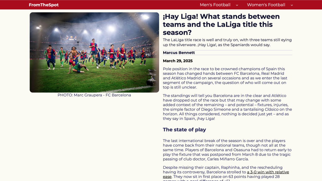 This is an extract from a feature I wrote for FromTheSpot. It was a deep dive to find out who would win the Spanish La Liga 2024/25 title. It was a joy to have the freedom to write about continental football, especially from Spain, and to showcase my wide knowledge of the sport. Now as part of their team, I have been writing match reports covering the Premier League and La Liga.